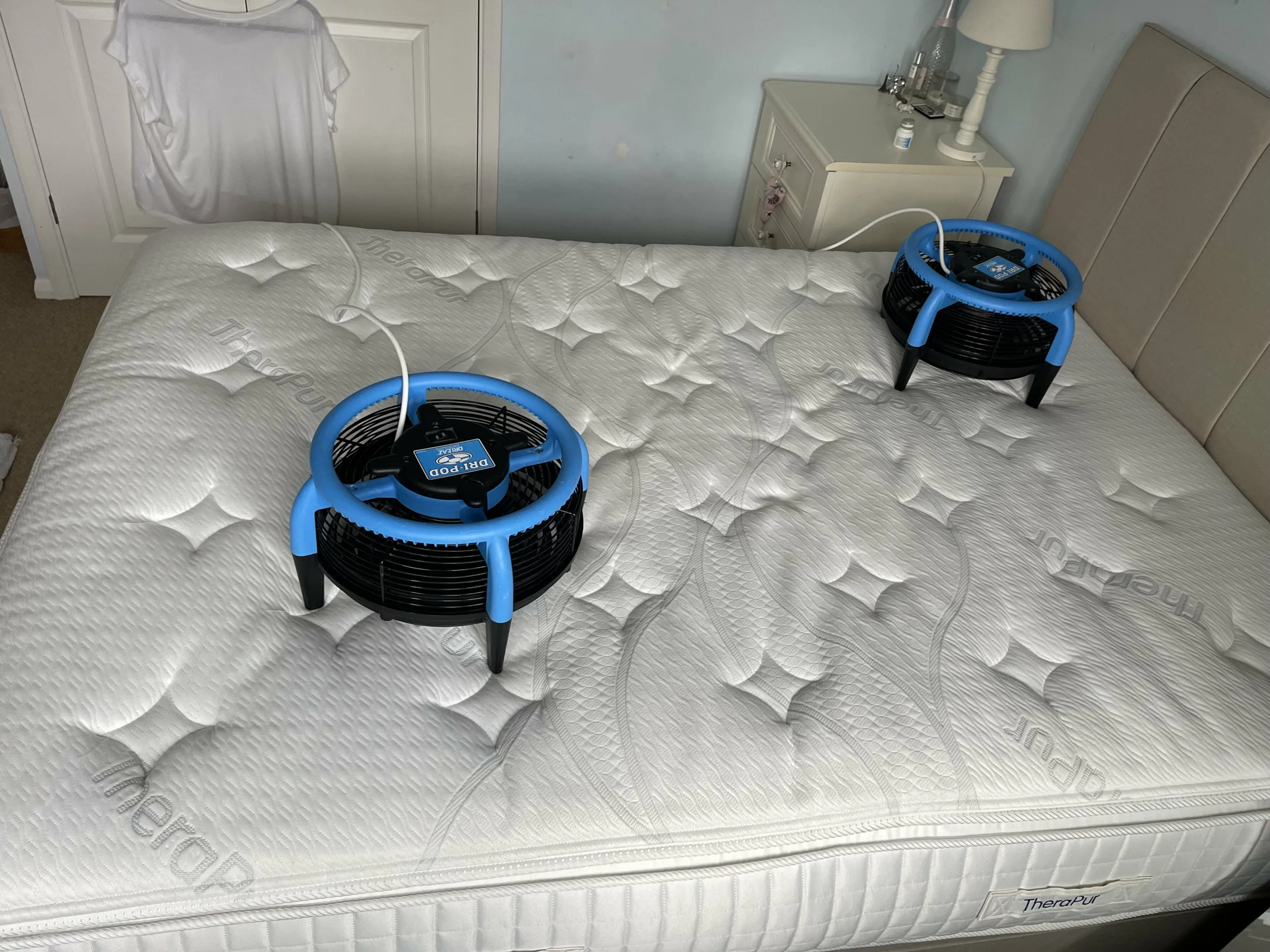 We then place on the mattress, high-flow drying fans that blow air to speed the drying of the Mattress. Your mattress will be Dry within Hours, Not Days for a comfortable, healthier sleep.
